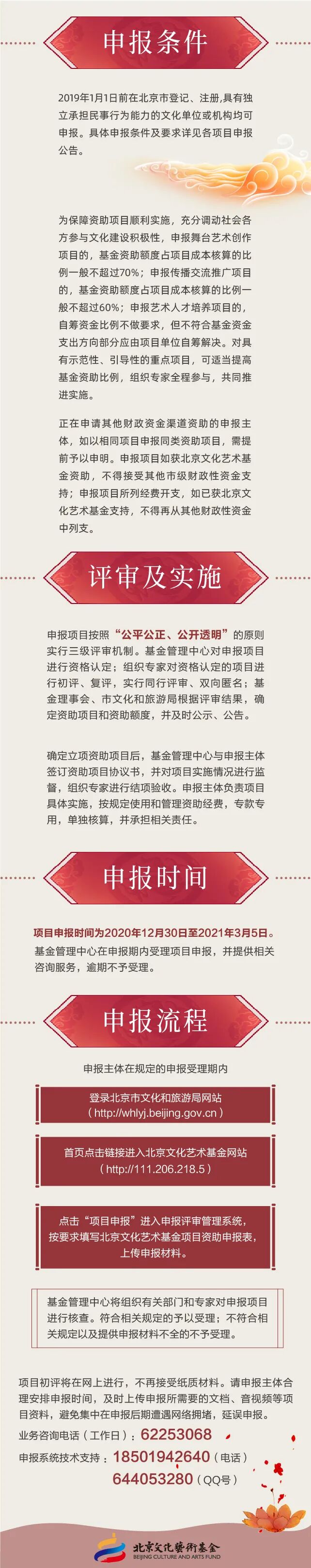 2019年1月1日前在北京市登记、注册,具有独立承担民事行为能力的文化单位或机构均可申报。具体申报条件及要求详见各项目申报公告。
